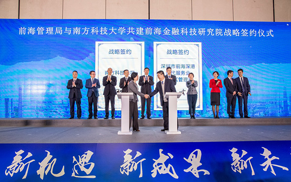 12月7日,“新機遇•新成果•新未來——2019前海成果發(fā)布會”在前海深港合作區(qū)舉行。發(fā)布會上,前海管理局局長助理、前海地方金融監(jiān)管局常務副局長文娉與南方科技大學校長辦公會成員王鵬飛代表雙方簽署了“前海管理局與南方科技大學共建前海金融科技研究院”的戰(zhàn)略合作協(xié)議。深圳市委常委、前海蛇口自貿(mào)片區(qū)管委會主任、前海管理局局長田夫等領導見證簽約。