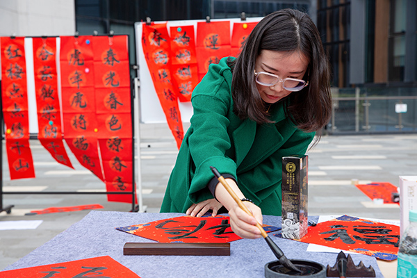 活動(dòng)現(xiàn)場(chǎng),專業(yè)書法老師凝神聚氣、揮毫潑墨,一副副對(duì)聯(lián)蒼勁有力、氣韻生動(dòng)。現(xiàn)場(chǎng)群眾興致勃勃地挑選各種贊頌時(shí)代、歡慶新春的春聯(lián)。“春色明媚山河披錦繡、華夏騰飛祖國(guó)萬年輕”“虎添雙翼前程遠(yuǎn)、國(guó)展宏圖事業(yè)新”“平安如意吉星照、金虎呈祥福滿堂”……大家互相幫忙,有的忙著牽紙,有的忙著晾曬,臉上無不洋溢著幸福和喜悅。