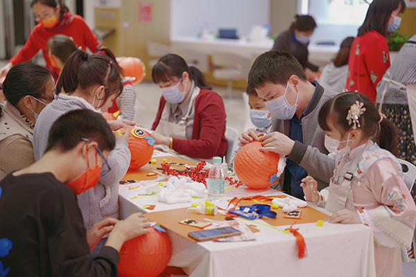 大家參與活動的熱情空前高漲,不少人攜家人一同參加,活動現(xiàn)場歡聲笑語、其樂融融。憨態(tài)可掬的醒獅燈籠和頗具挑戰(zhàn)的毛線戳戳繡,激發(fā)了大家的手工制作熱情。在老師的細心講解和演示下,孩子們同父母齊心協(xié)力,共同動手制作出飽含溫情和幸福的作品。