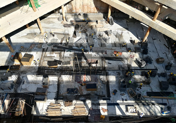 此次首塊澆筑底板位于地塊北區(qū),基底地質(zhì)條件復(fù)雜,土質(zhì)含水率較高,施工條件較差。經(jīng)過前期暗埋排水、設(shè)置集水井等措施,有效降低了土質(zhì)含水量,克服了多工種同時作業(yè)的不利影響。經(jīng)過33小時的連續(xù)奮戰(zhàn),進(jìn)場罐車達(dá)342車次,共計澆筑混凝土2733m³,最終打贏了這場攻堅戰(zhàn)。