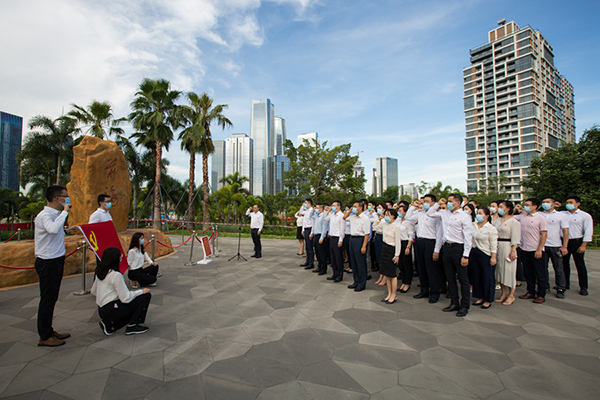 表彰會后,全體黨員赴前海石公園重溫入黨誓詞。全體黨員面對黨旗,由孟曉同志領誓,向著黨旗作出莊嚴承諾,不忘初心、牢記使命,以永不懈怠的精神狀態(tài)和一往無前的姿態(tài),為前海金融事業(yè)發(fā)展而奮斗。