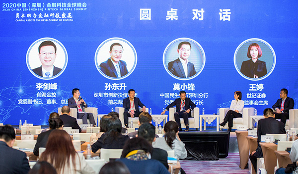 隨后的圓桌對話環(huán)節(jié)由前海金控黨委副書記、董事、總經(jīng)理李劍峰主持。深圳市創(chuàng)新投資集團前總裁孫東升,中國民生銀行股份有限公司深圳分行黨委委員、副行長莫小鋒,世紀證券監(jiān)事會主席王婷,前海中船股權投資基金副總經(jīng)理倪穎圍繞“資本助力金融科技發(fā)展”展開研討。